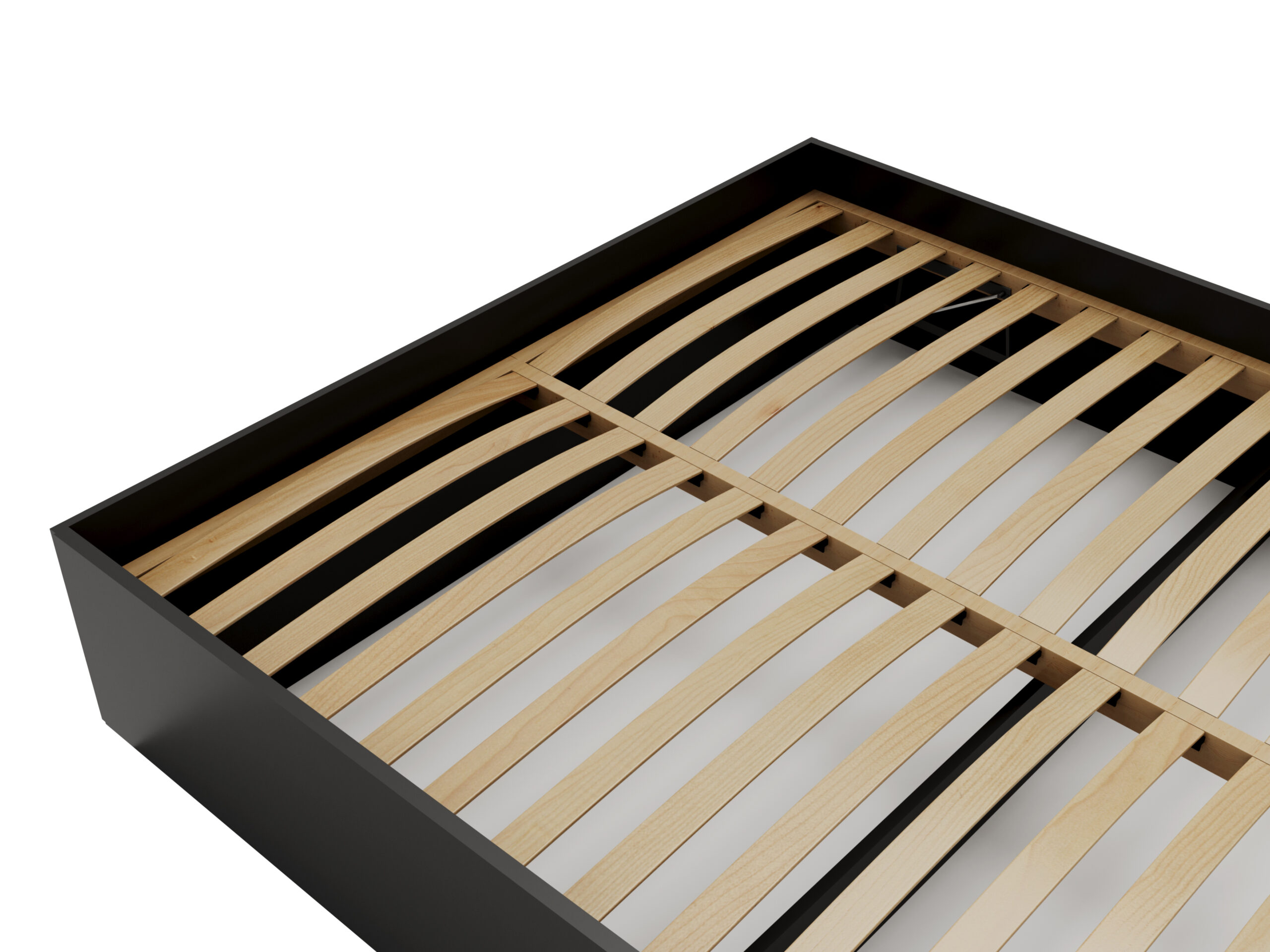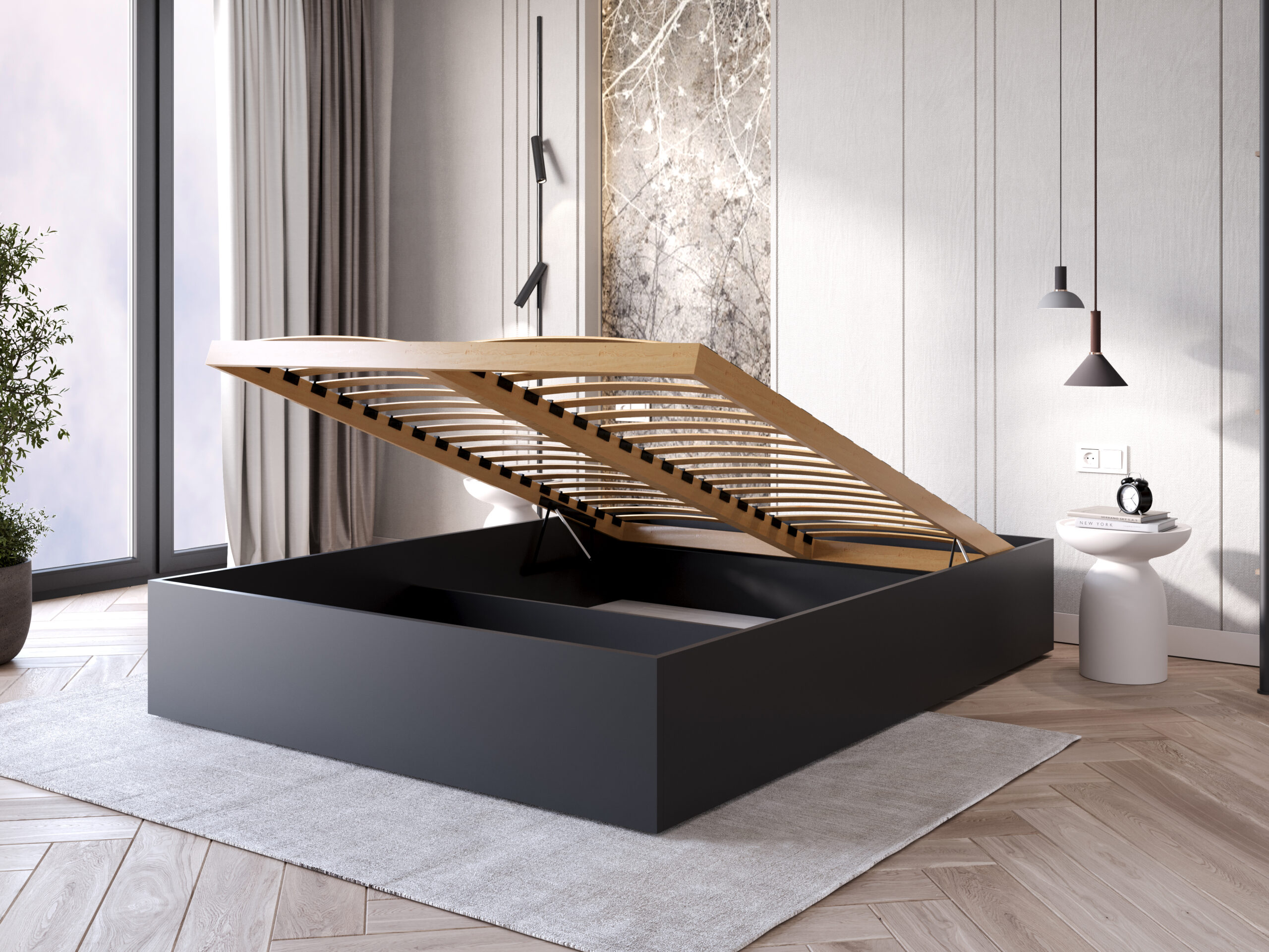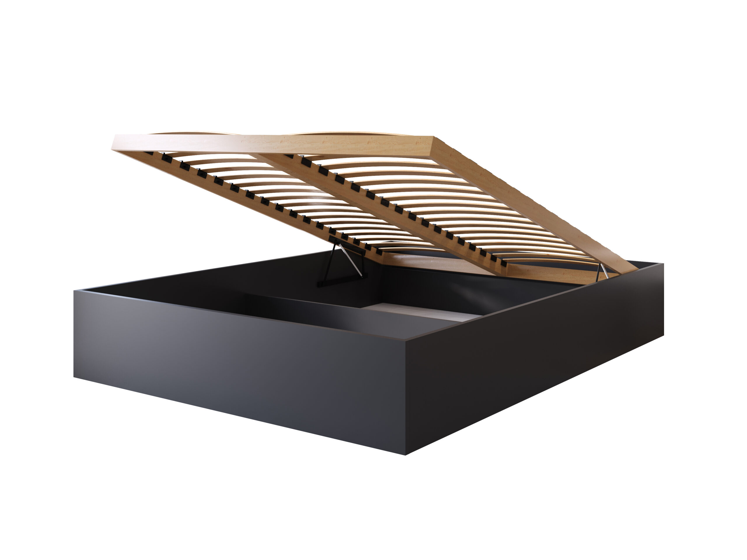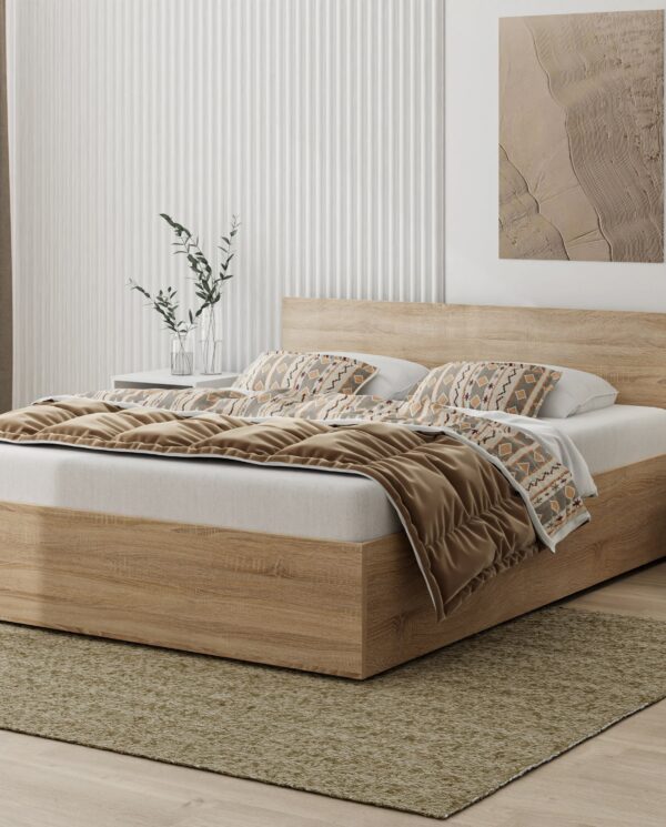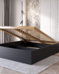 Inteligentne przechowywanie: Dzięki konstrukcji opartej na 3 poprzecznych podporach, wnętrze łóżka skrywa dwie przestronne i funkcjonalne przegrody. To idealne miejsce na zapasową pościel, koce czy sezonową garderobę.