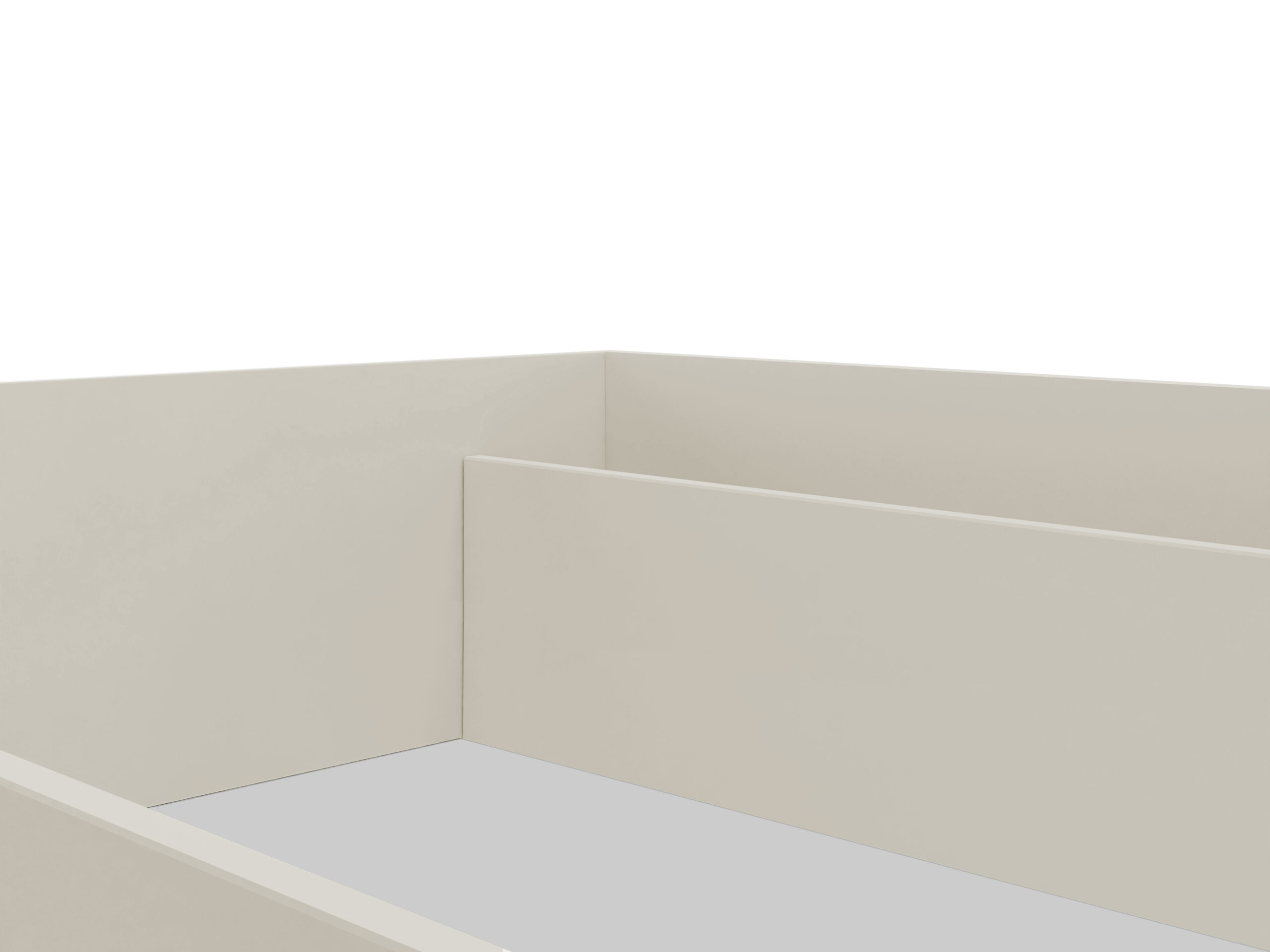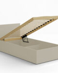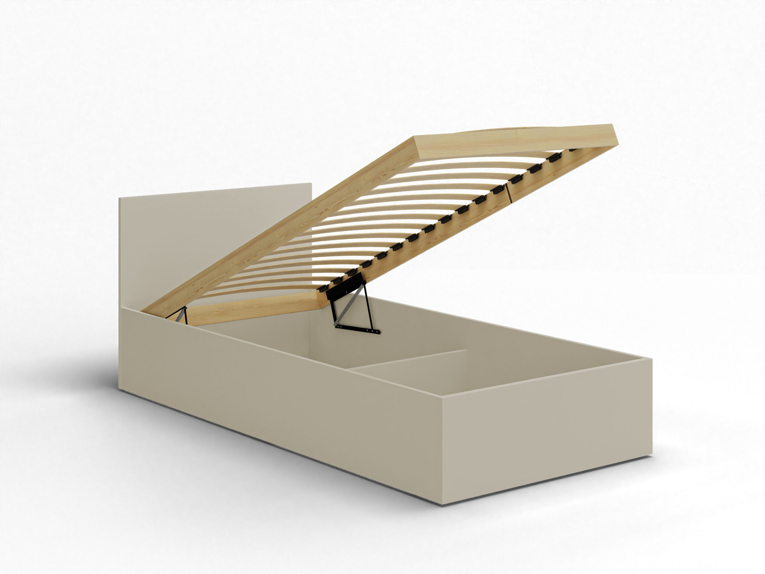 - Inteligentne przechowywanie: Wnętrze łóżka zostało wzmocnione 3 poprzecznymi podporami, które tworzą dwie funkcjonalne przegrody – idealne na pościel lub sezonowe ubrania.